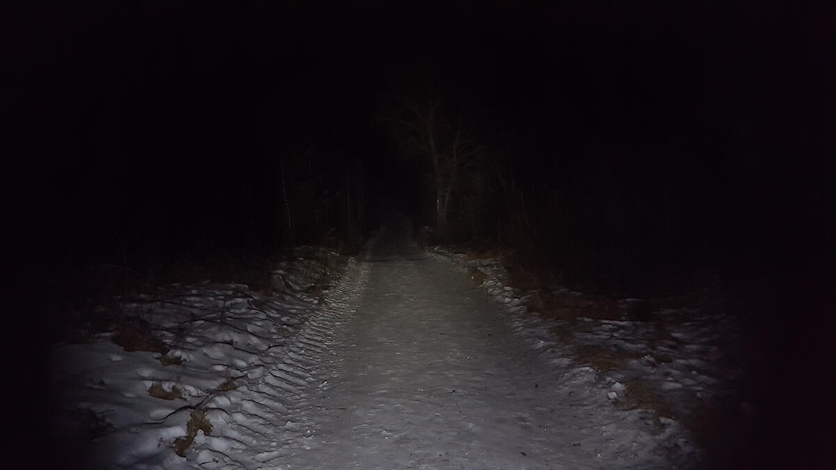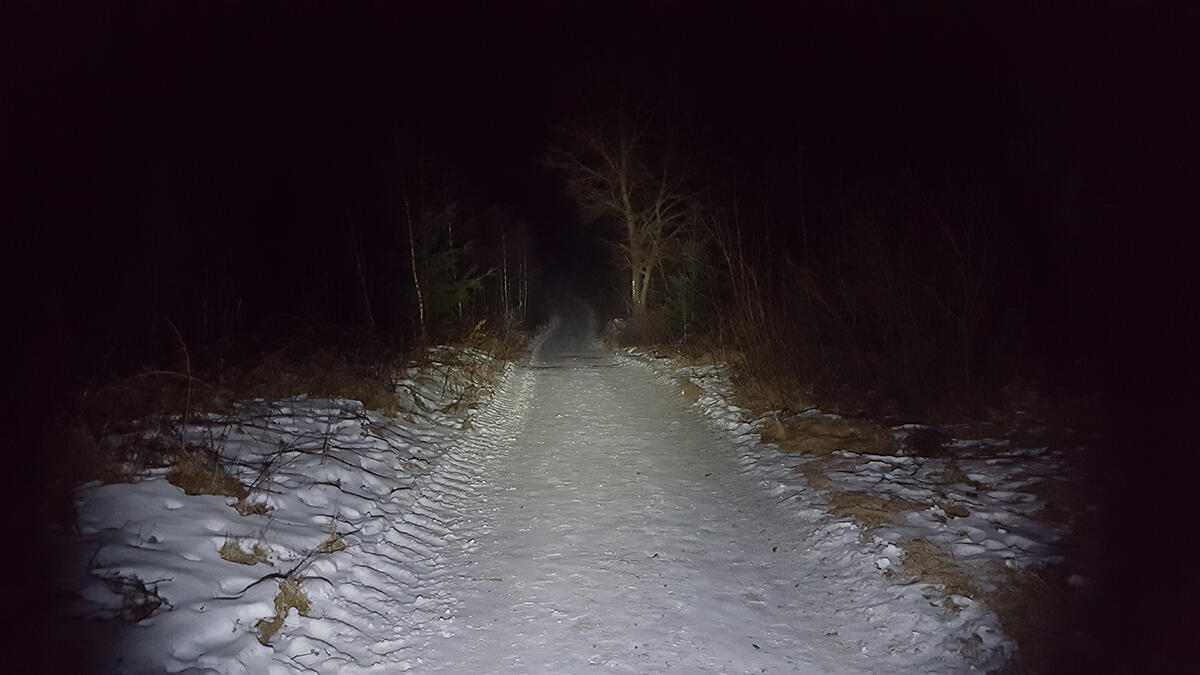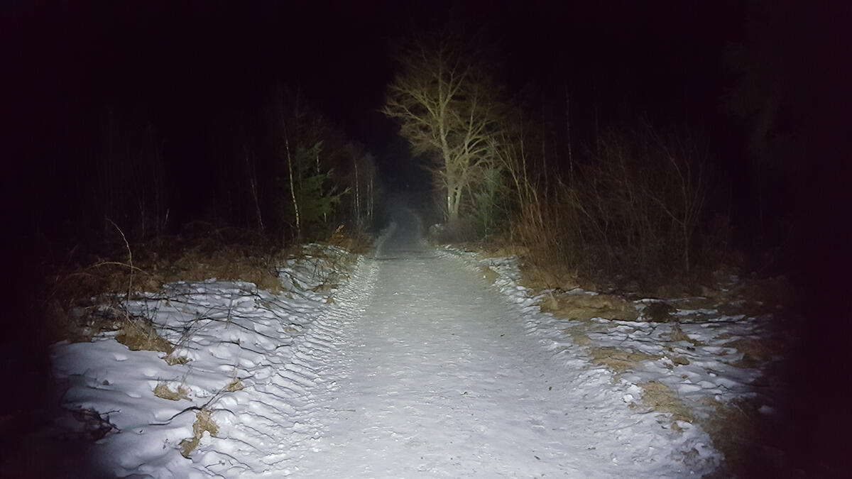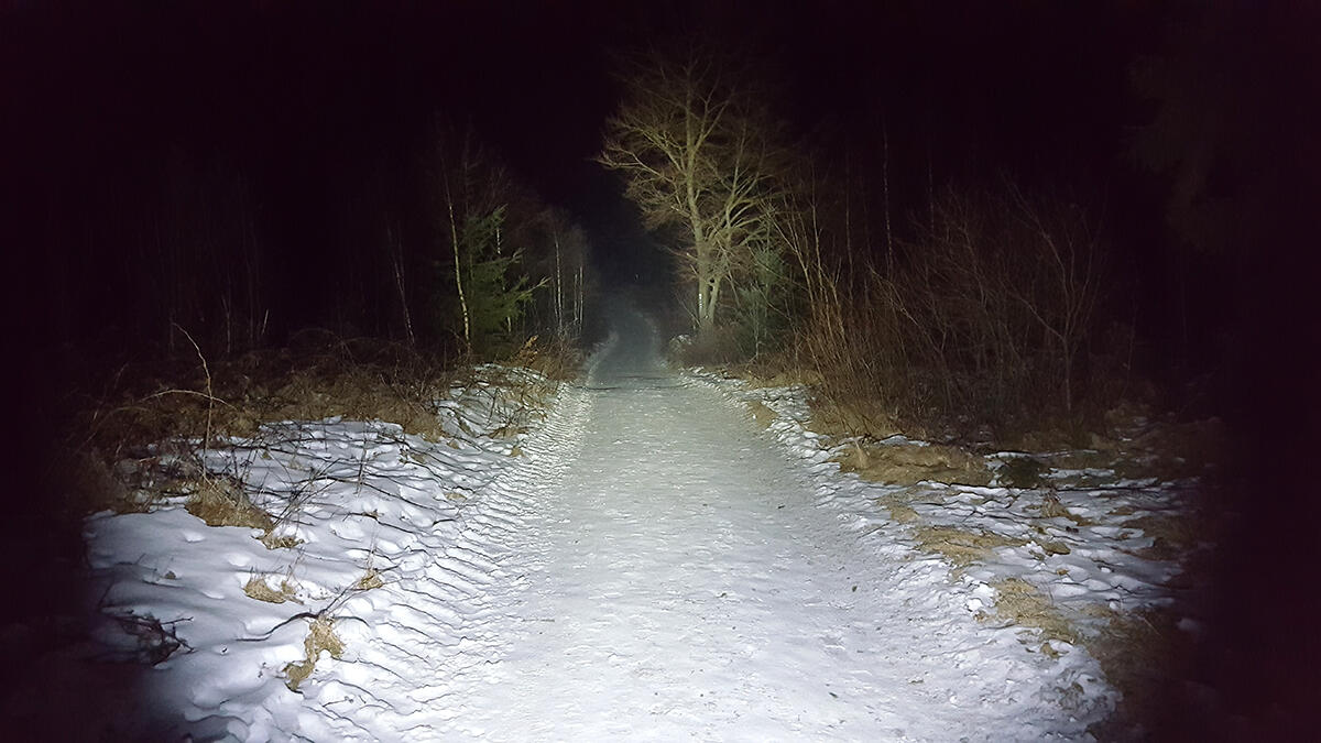 Bei den Fotos müsst ihr beachten, dass leichter Schnee-Frost lag, was die Wirkung der Lampe natürlich ein wenig verfälschen könnte. Ich denke man bekommt aber trotzdem einen guten Eindruck von der Lichtleistung. Die 0,5 Lumen Stufe ließ sich mit meiner Kamera verständlicherweise nicht einfangen.