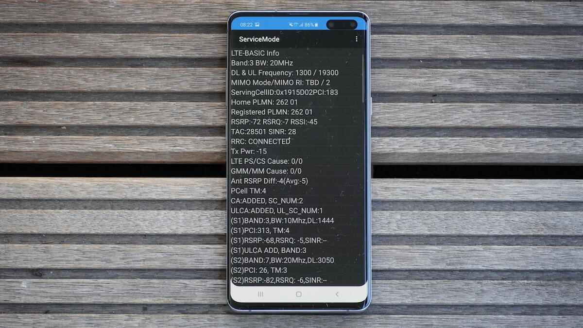 Wie hier am Samsung Netmonitor sichtbar, nutzt die Telekom im Downlink sowie um Uplink Carrier Aggregation. Hier: 3CA DL, 2CA UL.