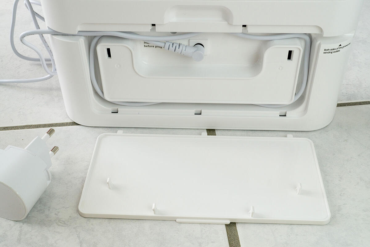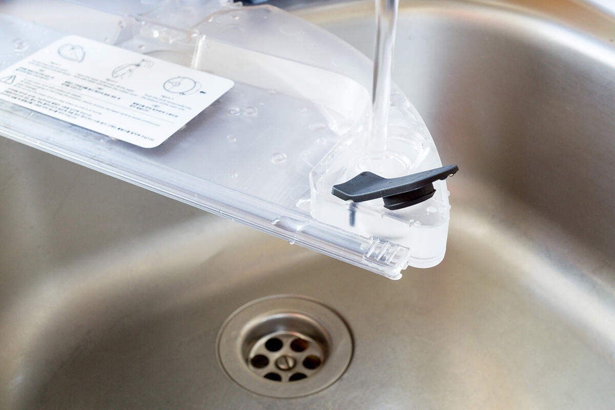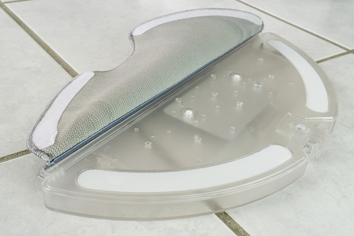 Prinzipiell arbeitet der einschiebbare Mopping-Einsatz mit einem Wasserbehälter von 150 ml Fassungsvermögen wie erwartet. Die gesamte Fläche wird einmal gleichmäßig feucht durchgewischt. Um die Reinigungsleistung zu verbessern, habe ich noch 1-2 Tropfen Neutralreiniger zum Wasser dazugegeben. Aber auch der hilft ohne mechanische Arbeit natürlich nicht, festgetrocknete Flecken oder Ähnliches zu lösen und zu entfernen.