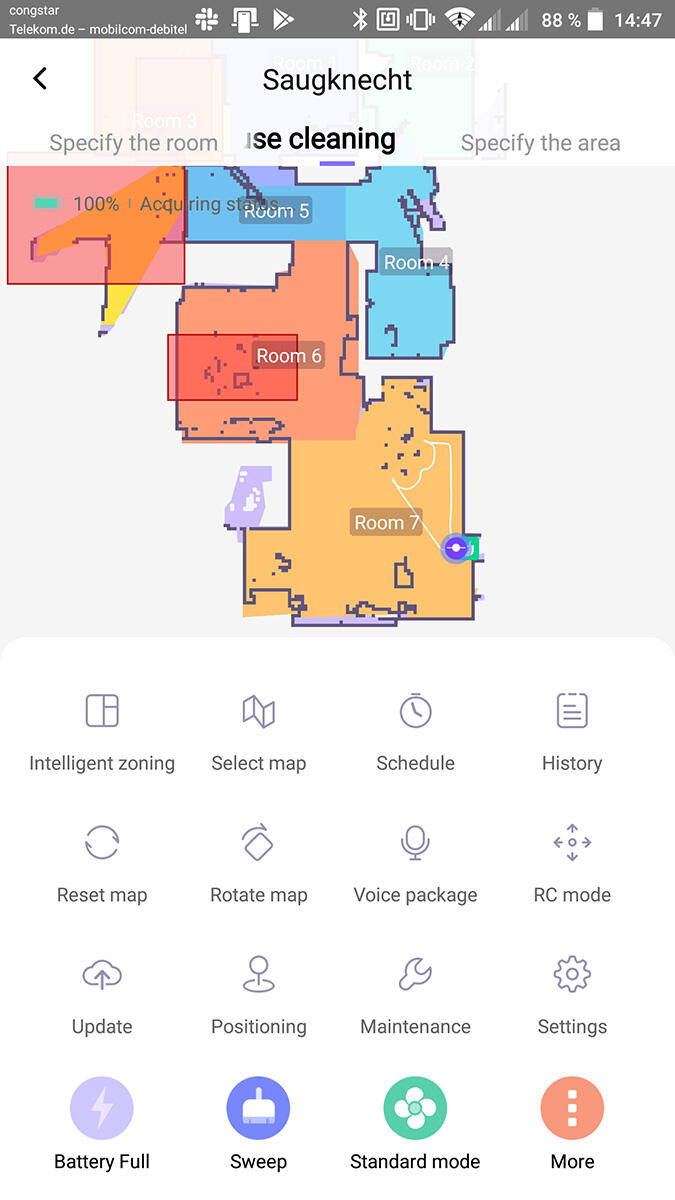 Recht praktisch finde ich das „Intelligent zoning“, über das man nicht nur die zu reinigenden Räume auswählen, sondern auch direkt die Reihenfolge bestimmen kann, in der sie abgearbeitet werden sollen. Unter diesem Menüpunkt kann man den Zimmern auch gleich noch sinnvolle Namen zuweisen.