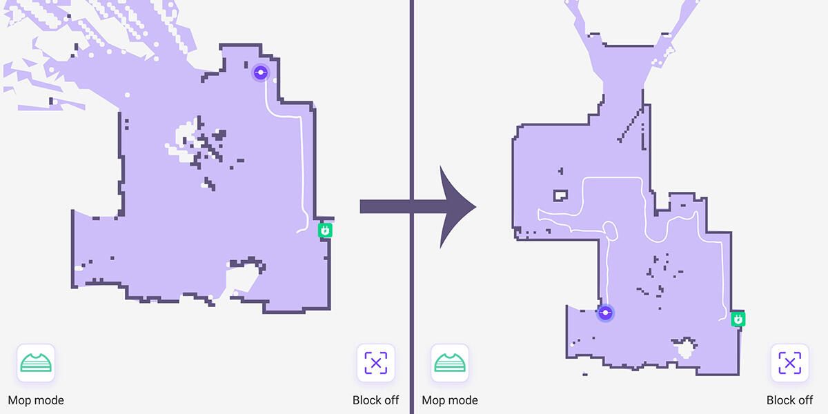 Zudem funktioniert im Mopping-Modus die Teppicherkennung leider nicht wie gewünscht. Damit wird zwar geworben, da der Roboter für dessen Detektion aber erstmal komplett auf den eigentlich zu meidenden Bodenbelag drauffahren muss, ist das Feature hier relativ sinnlos. Es bleibt einem also nur die Möglichkeit, eine bereits eingangs erwähnte Mopping-Block-Off-Area zu erstellen, innerhalb derer zwar gesaugt, aber nicht gewischt werden darf.