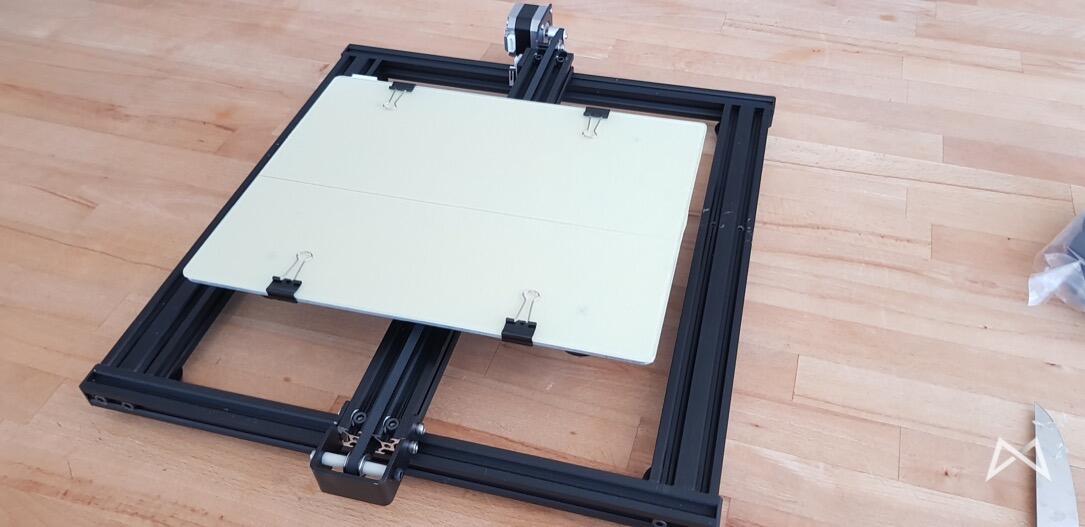 Ebenfalls ein schickes Detail ist die beheizbare Druckplattform, welche direkt noch eine Glasplatte on top spendiert bekommt. Selbige wird mit kleinen Klemmerlein am Drucker festgemacht.