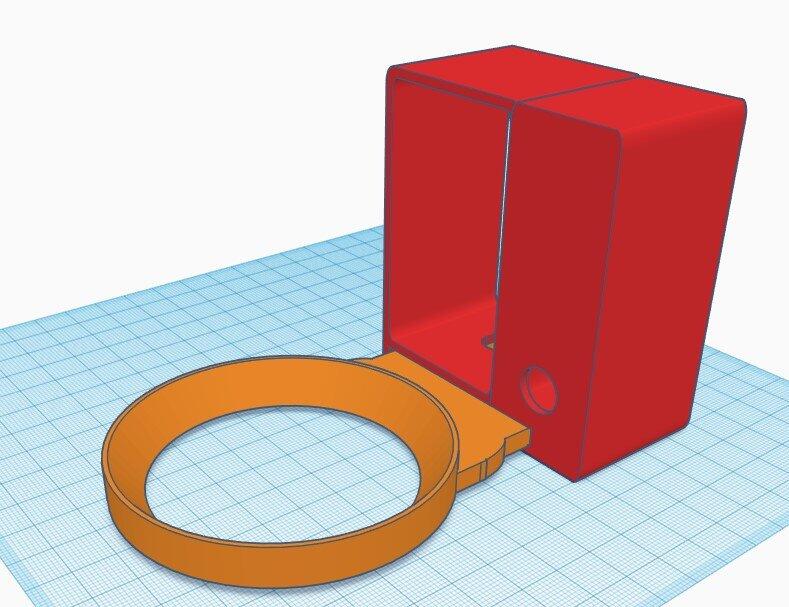 Nachdem ich auf Thingiverse nicht fündig wurde, musste ich eben tinkercad.com anwerfen und selbst was basteln. Die ersten beiden Versuche waren im Grunde für den Hintern, weil an diversen Stellen zu dünn und brüchig und von der Form auch noch nicht das Gelbe vom Ei. Die dritte Version konnte ich dann aber schon nutzen. Allerdings hing das Kabel noch rechts neben der Halterung im freien und musste mit Kabelbinder fixiert werden und der Dot stand auch weiterhin nur auf einer Plattform und hätte sehr leicht herunterfallen können.