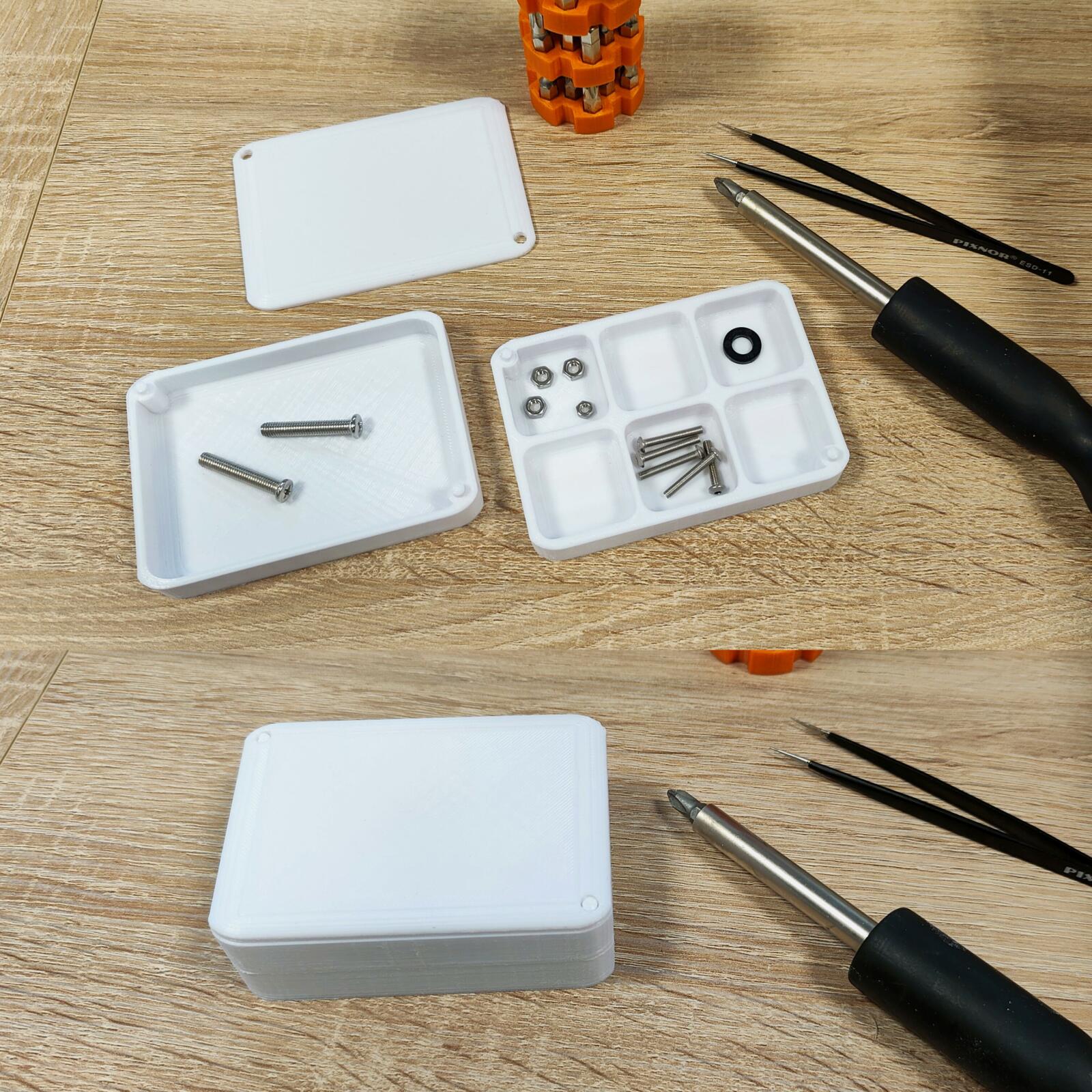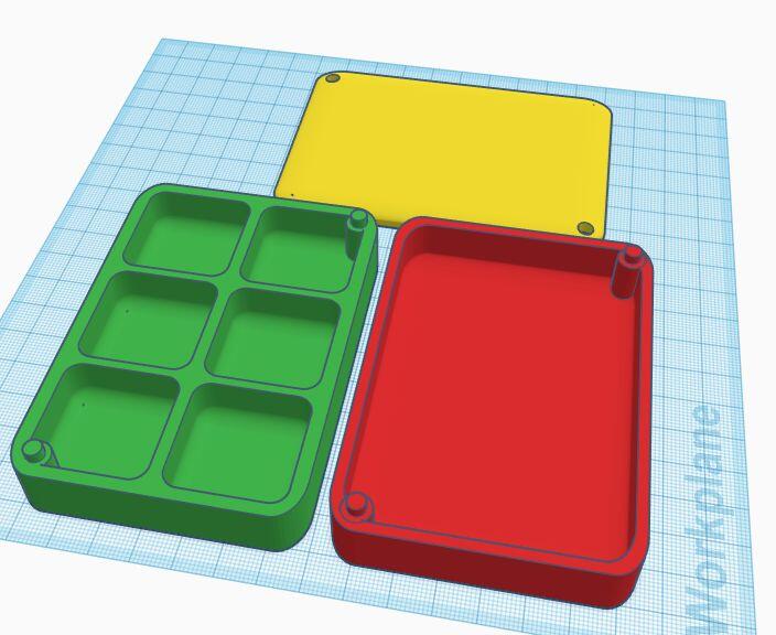Also praktisch eine kleine Schale (10cm lang) mit ein paar kleinen Fächern (1.3 cm tief) und dazu noch eine Schachtel ohne diese Fächer plus einen Deckel. Dazu sollten die Fächer noch stapelbar sein. Das habe ich durch Löcher auf der Unterseite und Stöpsel auf der Oberseite erreicht. Passt prima. Ich habs in PLA mit 0.3er Auflösung gedruckt. Ging dann zeitlich in Ordnung (4 Stunden rum) und genügt mir für diese Bastel-Arbeiten locker.