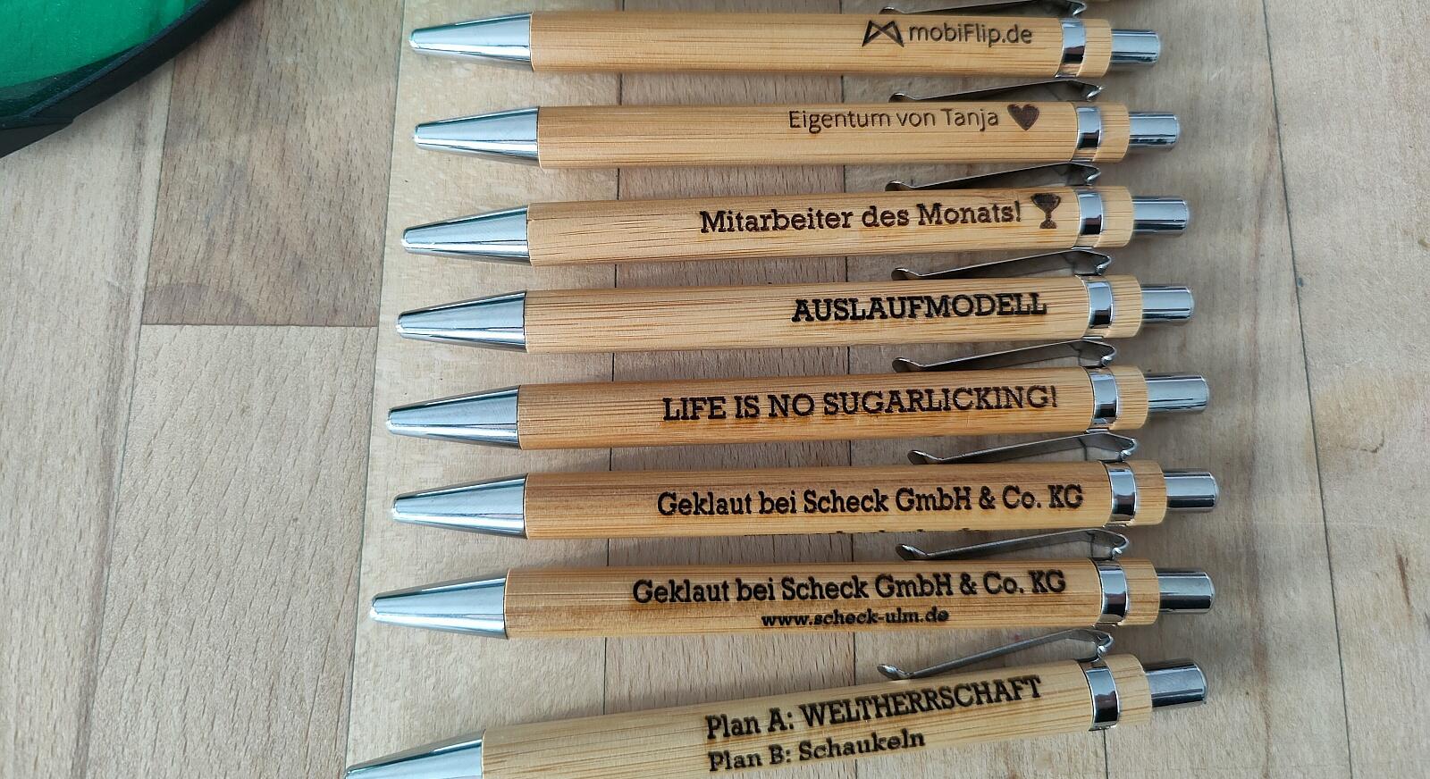Nachdem in meinem Bekanntenkreis aber kaum jemand mehr mit Bleistift schreibt, fiel meine Wahl auf Kugelschreiber mit Bambus-Hülle. Die gibt es in verschiedensten Verpackungseinheiten auf Amazon & Co.