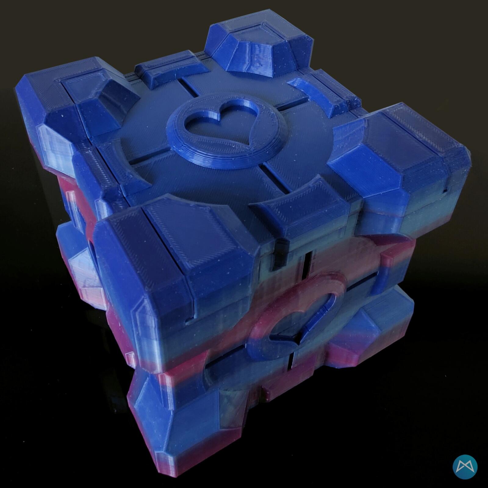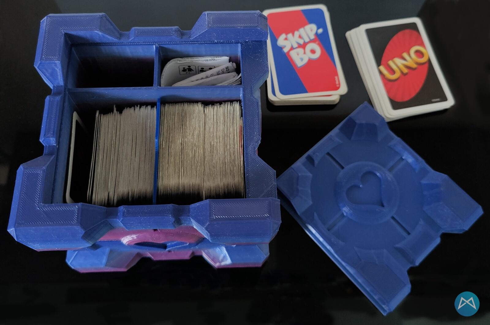 Eines meiner ersten größeren Druck-Projekte war der Companion Cube. Ich nutze ihn als „Spielesammlung“ für UNO, SKIP-BO-Karten und ein paar Würfel und der Würfel kommt immer sehr gut an, wenn ich ihn auf den Tisch stelle.
