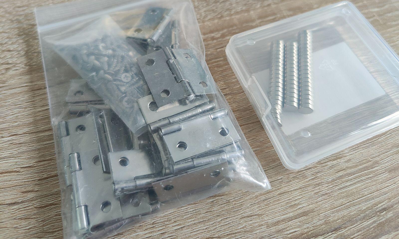 Die Schrauben sind mittlerweile auch schon eingetroffen. Auch die Magnete und Scharniere, die man für den Verschluss der Boxen benötigt, sind innerhalb von 2 Tagen von Amazon eingetroffen.