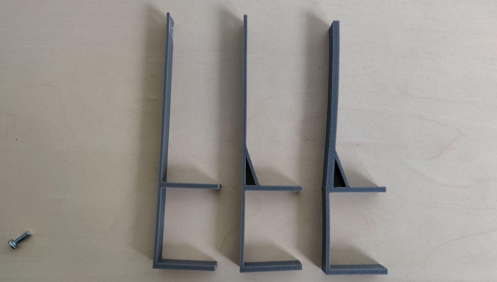 Also musste der obere Teil der Verstrebung dicker und stabiler werden und ich präsentiere den dritten Versuch ganz rechts. Damit hängt der Lautsprecher nun schön unterhalb des Monitors.