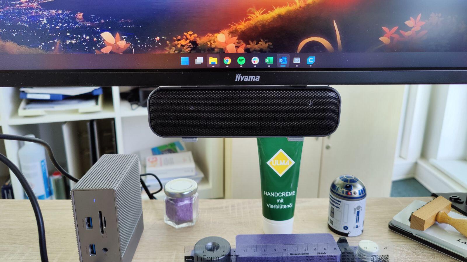 Für den neuen Laptop in der Firma musste ich mir einen neuen Lautsprecher gönnen. Das liegt zum einen an dem Totalversagen der Bagn&Olufsen Sounds im HP ZBook und zum anderen daran, dass ich den Ton gern von vorn habe und nicht seitlich. Da ich aber den Laptop (links) plus zwei 24 Zöller (mitte und rechts) in der Firma nutze, käme der Ton immer von links.