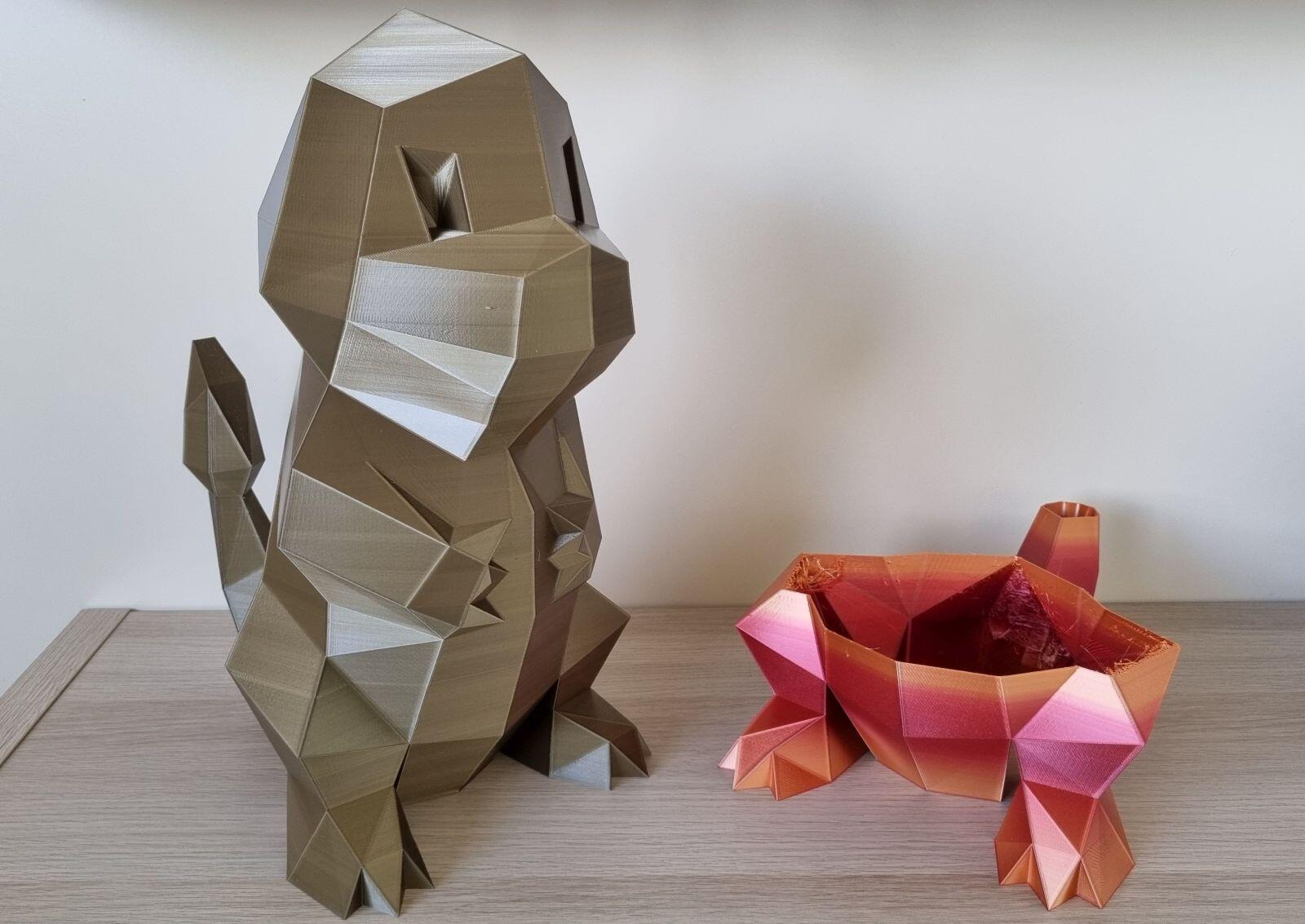 Ganz links ist dabei der orig. Glumanda in 5 cm Größe, daneben folgen dann 20 cm und 22 cm, welche ich mit dem Anycubic Vyper gedruckt habe und rechts der „Große“ mit satten 42 cm Höhe. Nur für den großen Charmander ging ca. 1/4 Rolle Filament drauf und die Druckdauer betrug 35 Stunden.