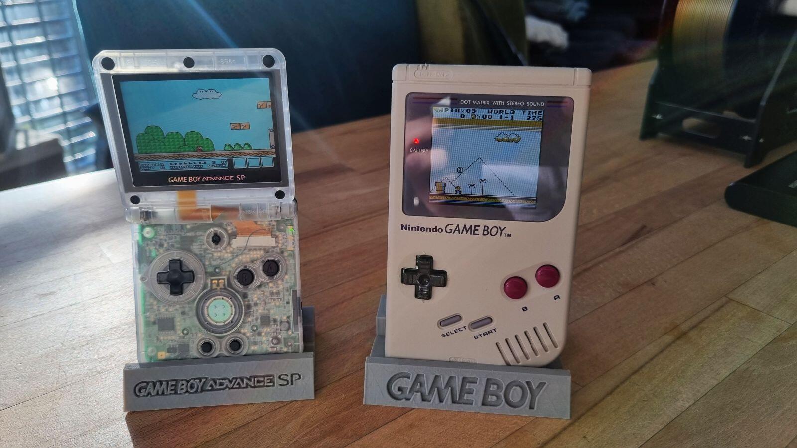 Zudem musste ein Teil der Retro-Nintendo-etc.-Sammlung mit neuen Stands versehen werden. Die alten haben einfach nicht mehr viel in der Vitrine hergemacht. Schöne Modelle gab es – ihr ahnt es sicher – auf Thingiverse für den GB Advance und den Ur-Gameboy. Letzteres habe ich minimal vergrößert, weil der GB sonst fast nicht reinpasst. Auch auf Standard-PLA in Grau mit 190/60 gedruckt.