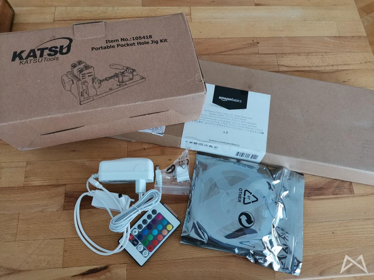 Dann ab zum Online-Versandhaus des Vertrauens, um mir diverse Kleinteile günstig zu schießen. (LED-Leiste, Topfscharniere, Noname KREK-Set für Pocket-Holes bzw. Taschenloch-Verbindungen, Schubladenauszüge, etc.) Teile davon fehlen noch auf dem Foto…