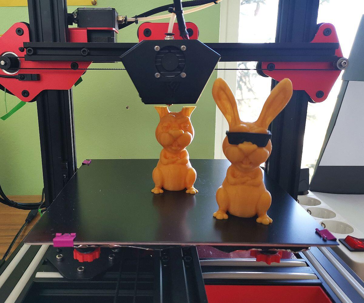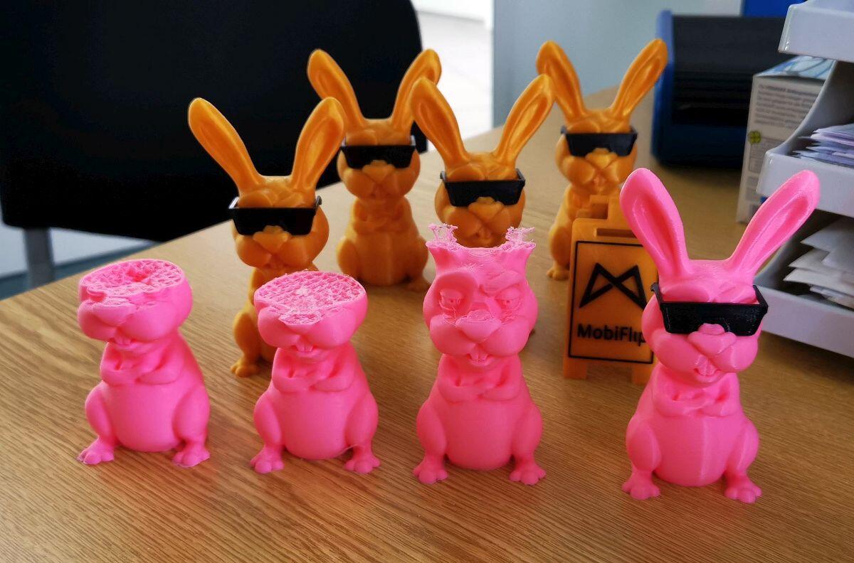 Die linken drei Versionen sind auf dem Creality CR 10S versucht worden. Temptower gedruckt, um die richtige Temperatur rauszufinden. Trotzdem mit paar Grad mehr und paar Grad weniger getestet und jedes Mal ist die Nozzle nach ca. 2/3 des Hasen verstopft. Den funktionstüchtigen #pinkbunny ganz rechts habe ich dann mit derselben Datei und demselben Filament in einem Rutsch und beim ersten Versuch mit dem Tevo Flash gedruckt.