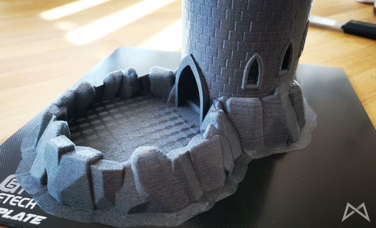 Für mich DAS Filament, wenn es um einen Burgturm geht. Schaut doch mega aus, oder? Da kann ich mir am Ende sogar das Lackieren des Turms sparen, so sexy finde ich den Druck. Auflösung 0,16 mm und bis zu dieser Höhe ungefähr 13 Stunden Druckzeit. Leider hatte ich vor dem Druck vergessen den Extruder zu kalibrieren.