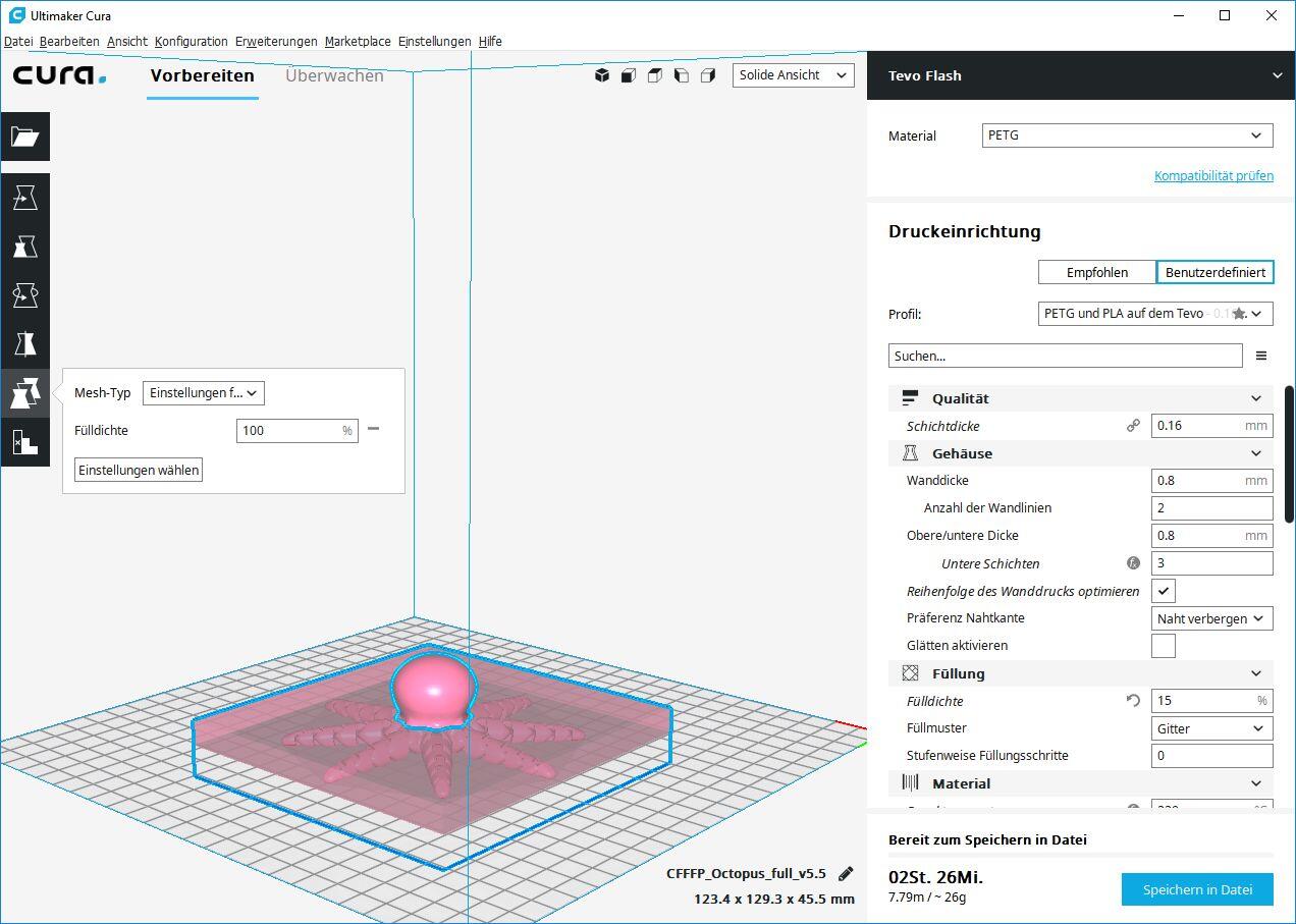 Der Rest vom selben Objekt dürfte aber oft gerne weiter mit 15 % Infill gedruckt werden, um Filament und Druckzeit zu sparen. Ich hätte bisher gedacht, das so etwas nur sehr kompliziert zu erreichen ist. Aber die Entwickler von CURA haben das suuuper einfach integriert.