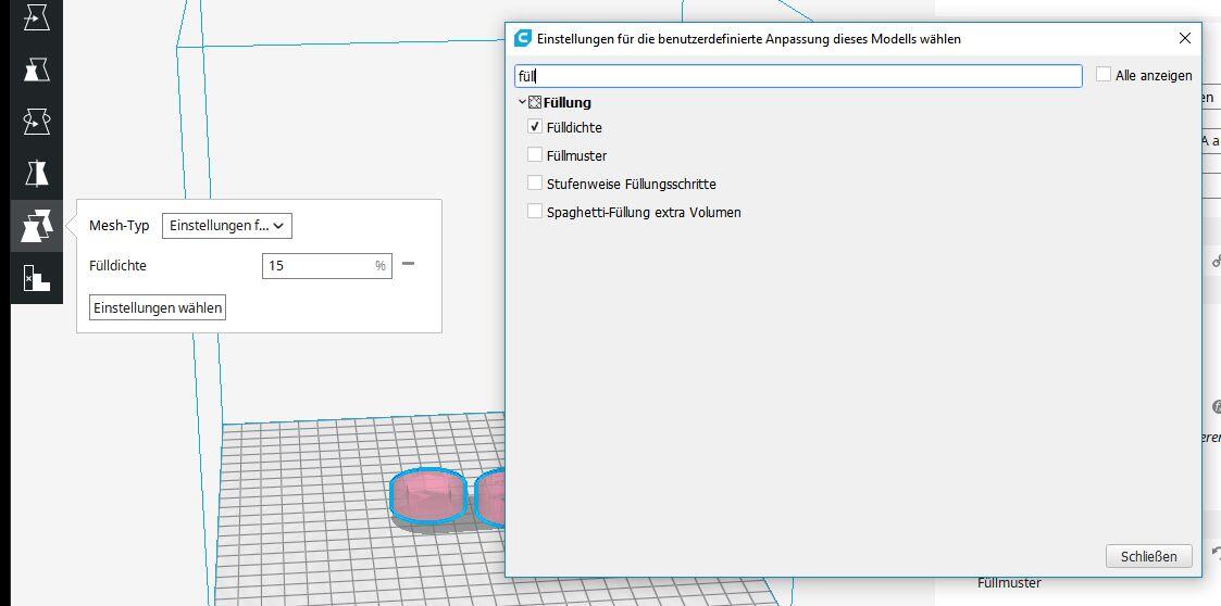 Nun mit angeklicktem Bereich links auf Einstellungen pro Projekt klicken und dort neben Mesh-Typ Einstellungen für Überlappung mit anderen Modellen bearbeiten auswählen. Nun erscheint ein Fenster, in welchem ihr dann beispielsweise nach Fülldichte suchen könnt.