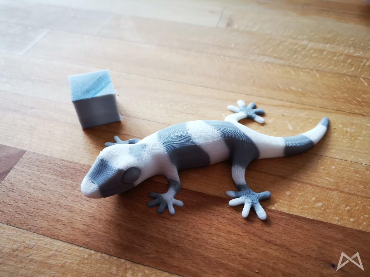Dazu wird der Purge-Tower neben dem eigentlichen Objekt gedruckt und in diesem wird dann je Layer die eine Farbe ausgespült und durch die andere Farbe ersetzt. Das sieht man am Verlauf im Würfel neben dem gedruckten Gecko.