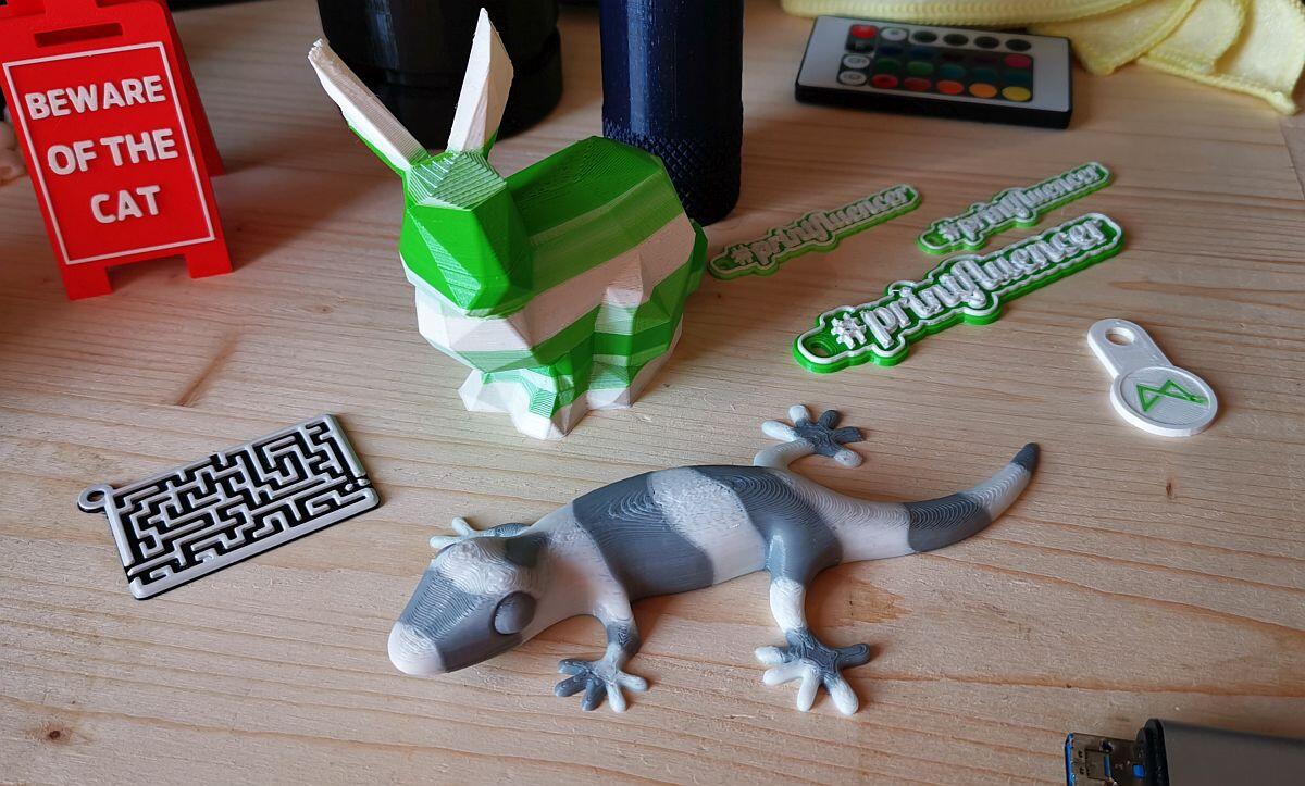 Um das Thema Dualcolor mit speziellen Druckern nicht gänzlich zu übertreiben noch einmal der Hinweis, dass auf dem obigen Foto einige Objekte mit einem ganz normalen Singlecolor Tevo Flash gedruckt wurden. Es kommt dabei natürlich immer auf das jeweilige Objekt an, aber wer noch einmal ein paar 3D Roundups zurück blättert, findet die Anleitung dazu, wie beispelsweise das Labyrinth, oder der rote Aufsteller ganz einfach auch mit einem normalen Drucker gedruckt werden können. Dafür muss während des Drucks nur pausiert werden und das andere Filament manuell nachgefüttert werden. Geht wirklich einfach und macht stellenweise auch ganz gut was her. :)