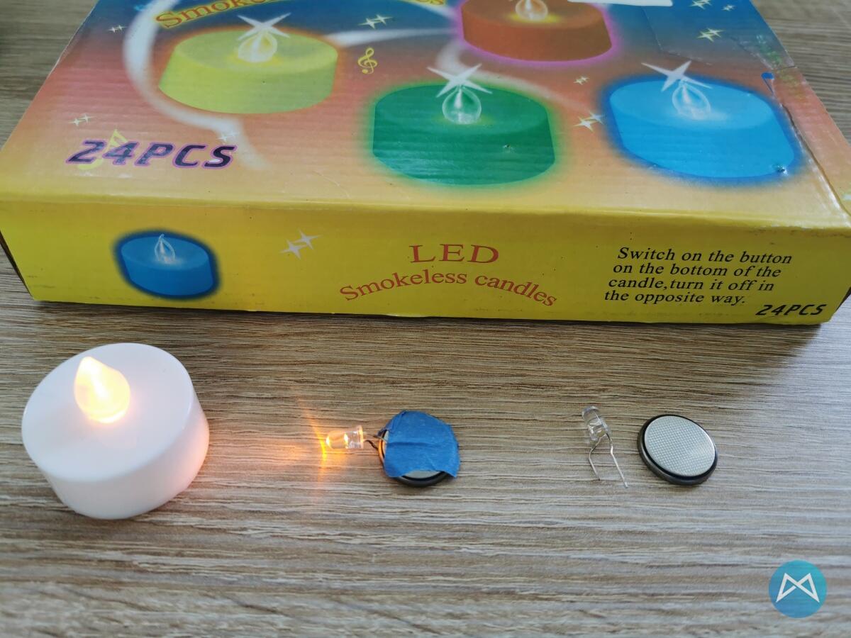 Nach einem kompletten Tag und einer Nacht leuchtete, flackerte und blinkte die LED gefühlt noch wie am ersten Tag. Keinen Plan, wie lange diese Bauweise durchhalten würde, da ja ein simpler Schalter fehlen würde. Ganz nebenbei ist es auch faszinierend, dass man mit bloßem Auge nicht erkennt, wie die LED dieses „Kerzenfeeling“ macht. Sie sieht aus wie jede normale LED ohne weiteren Chip o. ä.