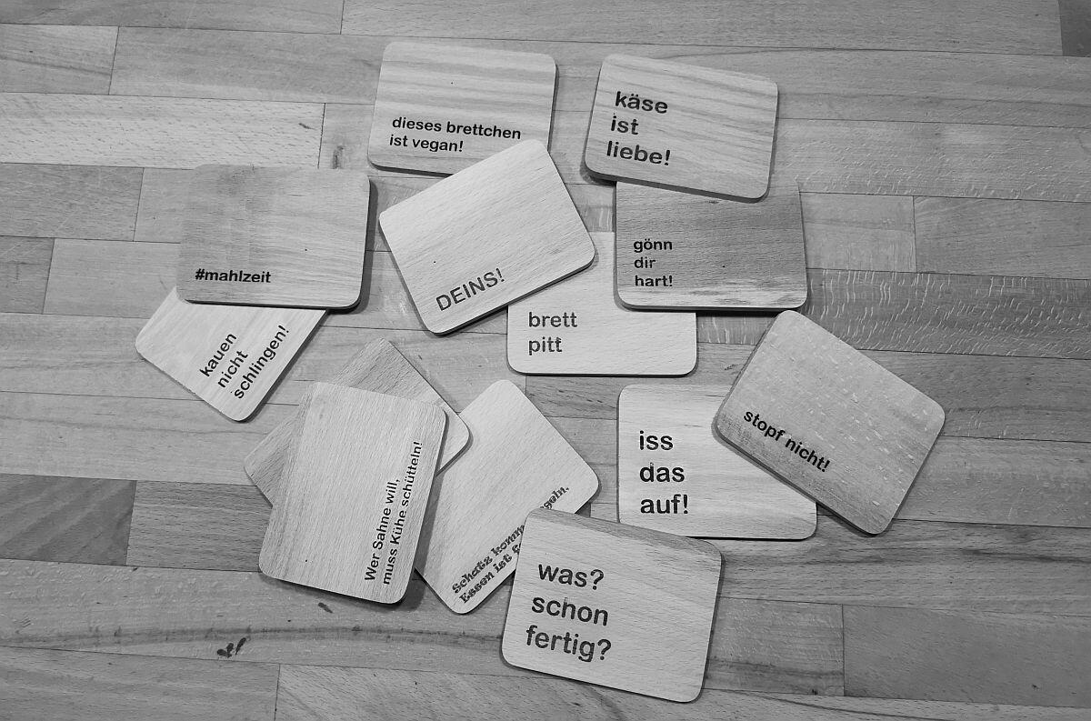 Im Ergebnis gab es Holzplättchen mit witzigen Sprüchen drauf: