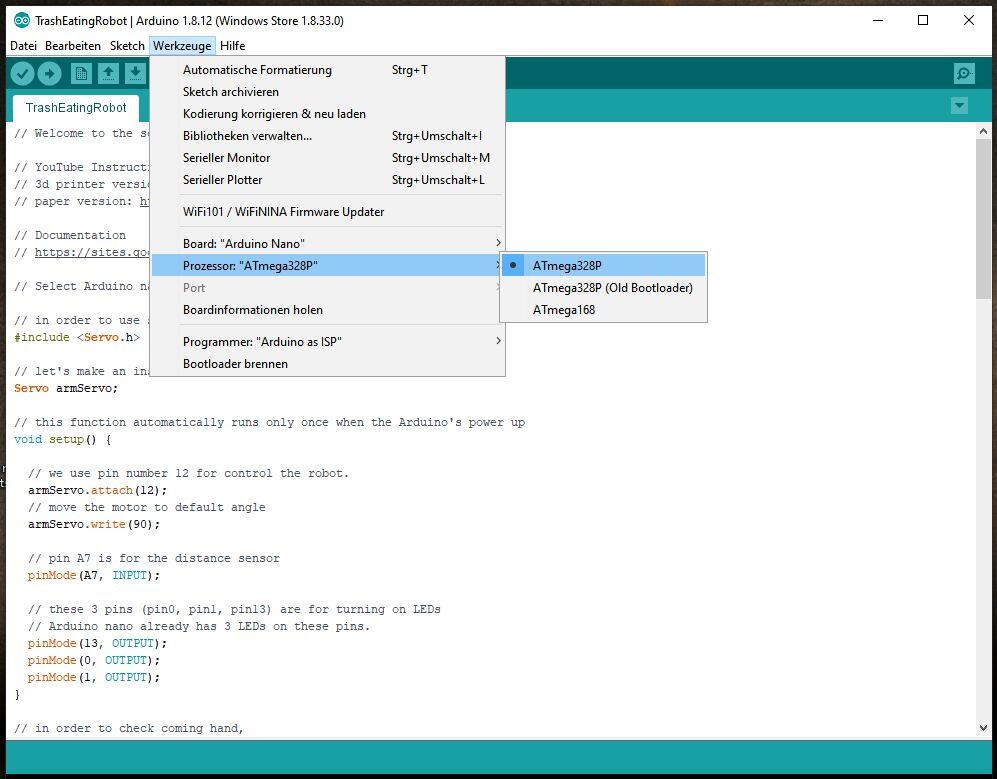 Nun muss der Arduino Nano noch mit dem entsprechenden Programm geflasht werden. Die nötige Datei findet ihr auf GitHub. Für meinen Arduino-Clone musste ich den neuen Bootloader auswählen. Danach war der Flashvorgang ratzfatz erledigt.
