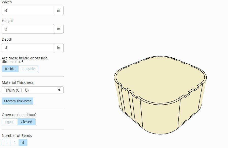 Es kann ausgewählt werden, ob die Schachtel offen oder geschlossen sein soll, eckig oder abgerundet und natürlich die Maße der Box. Am Ende macht alles der Konfigurator fertig und erstellt eine SVG oder DXF-Datei. Ideal, um sie mit dem Laser aus 3 mm Bastelholz auszuschneiden.
