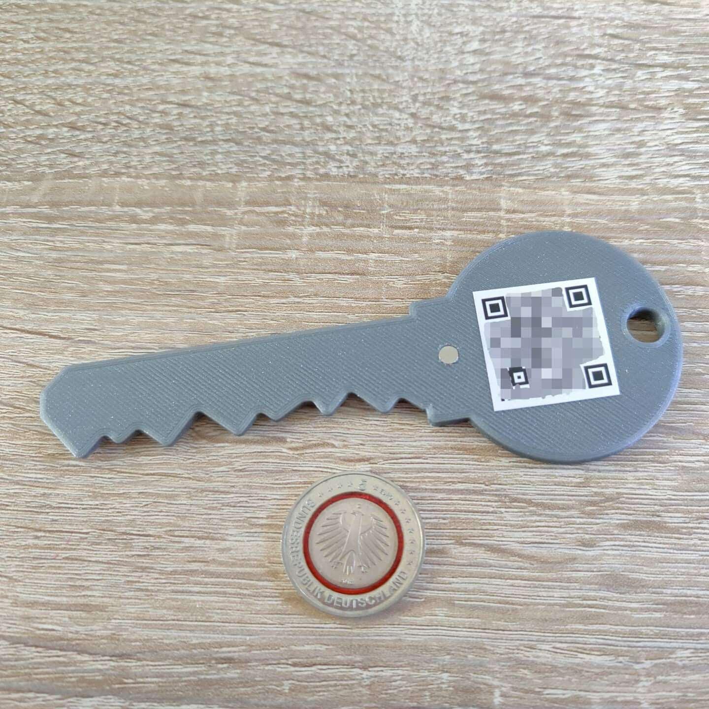 Im Original ist der KEY so erstellt worden, dass man während des Drucks in den Kopfbereich einen RFID-Chip/Aufkleber einlegt, welcher dann sozusagen durch den Druck direkt ins Objekt eingeschlossen wird. Der Chip kann dann später ganz bequem mit dem Smartphone beschrieben und ausgelesen werden. Da aber die i-Geräte dies nicht beherrschen, habe ich mich direkt für den QR-Code Aufkleber entschieden.