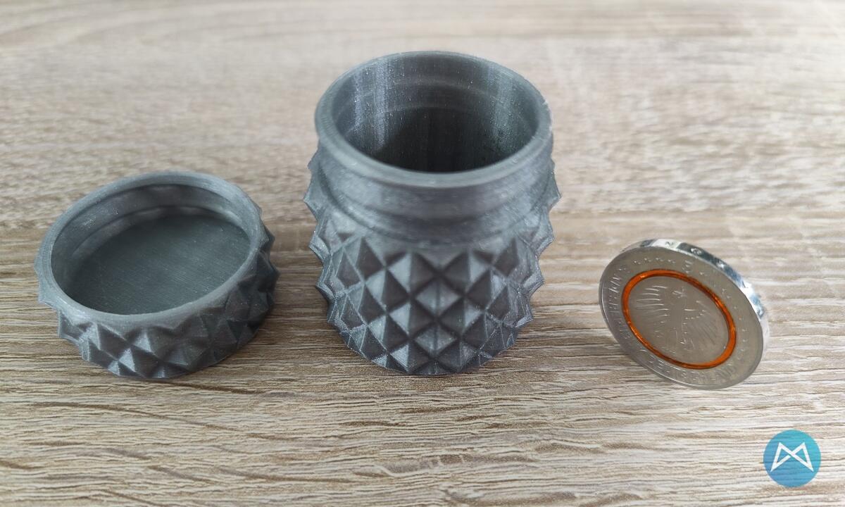 Das Döschen inkl. Schraubverschluss hört auf den Namen Knurled Capsule und schaut toll aus. Mir gefallen diese Oberflächen mit Diamant-Muster. Das schaut einfach gut und nicht sofort 3D-gedruckt aus und fühlt sich griffig an.