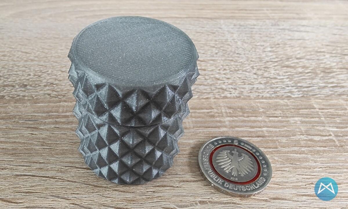 Gedruckt ist die Dose in glitzerndem Ecoline Steel PLA mit 200er Nozzle und 60er Bettchen auf dem Anycubic Mega-S (Link zum Testbericht).