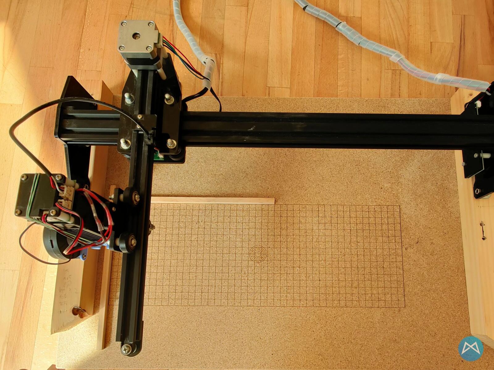 Während es in den Drucksachen etwas weiter unten um ein größeres Objekt für den 3D-Drucker geht, möchte ich mit dem Ortur Lasermaster 15W anfangen. Ich habe den Laser ja schon vor geraumer Zeit vergrößert und war irgendwie nie auf die Idee gekommen mir direkt mit dem fest montierten Laser das Raster aus Lightburn auf die Platte zu brennen. Das habe ich nun nachgeholt und so kann man tatsächlich viel leichter Objekte ausrichten.