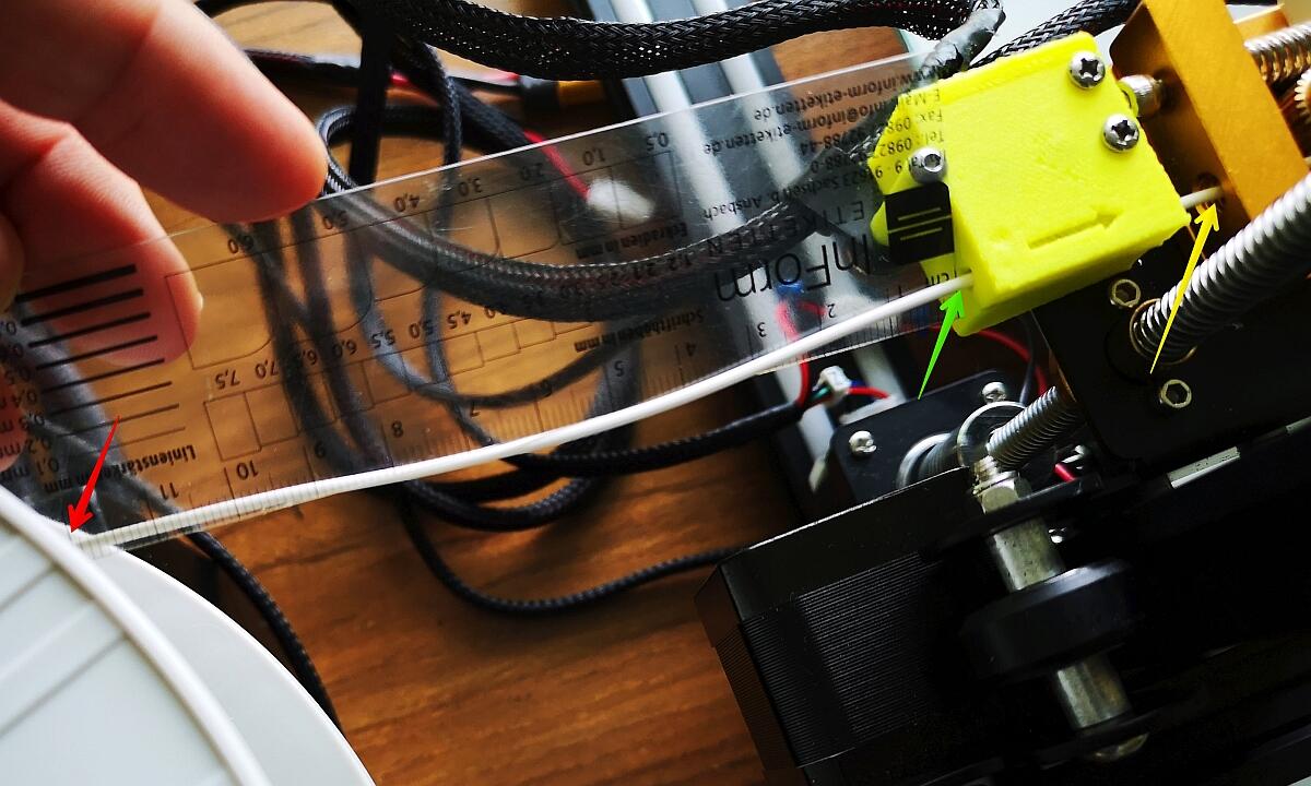 Der Drucker wird an den Rechner angeschlossen und man markiert vor dem Extruder 12cm (gelber Pfeil!) auf dem Filament (roter Pfeil). In meinem Fall habe ich vom Filament-Sensor aus gemessen (grüner Pfeil). Nun lässt man 10cm Filament durch und schaut, ob auch wirklich nur noch 2cm Rest bis zur Markierung auf dem Filament bis zum Filament-Sensor bzw. zum Extruder über sind.