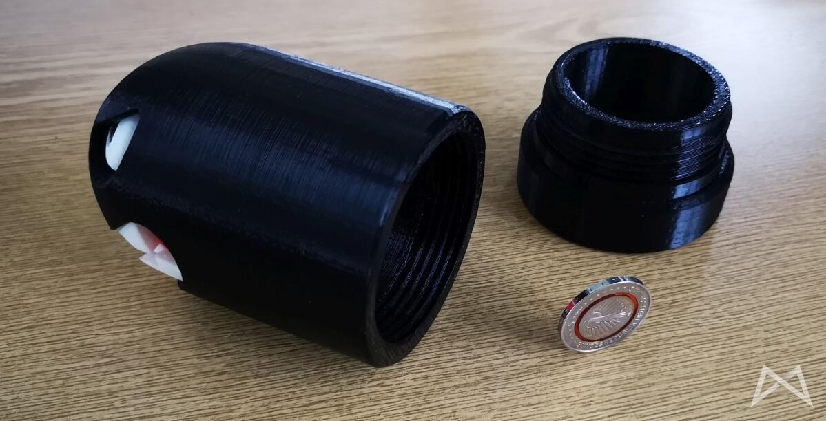 Nach dem Druck wird der rote Innenteil in das schwarze Gehäuse eingeschoben und dann von außen die obere und untere Zahnreihe eingesteckt. Dann noch die weißen Augen und die schwarze Pupille von außen reinfriemeln und das war es auch schon. Klappte alles auf Anhieb bei mir und sieht in Real noch viel besser aus!