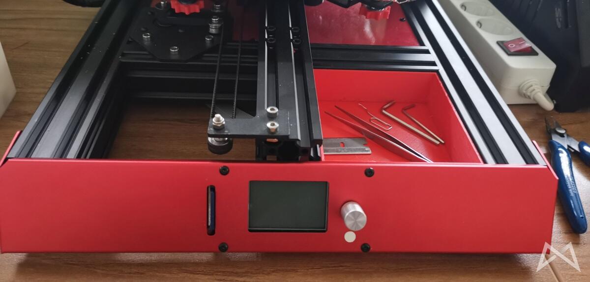 Es müssen lediglich ein paar Schrauben der Frontplatte gelöst werden und schon kann das Fach eingelegt werden. Im folgenden Foto auf der rechten Seite ist ein zusätzliches Fach eingelegt und links bleibt der Drucker vorerst Stock. Das Fach findet ihr wie immer auf thingiverse.com.