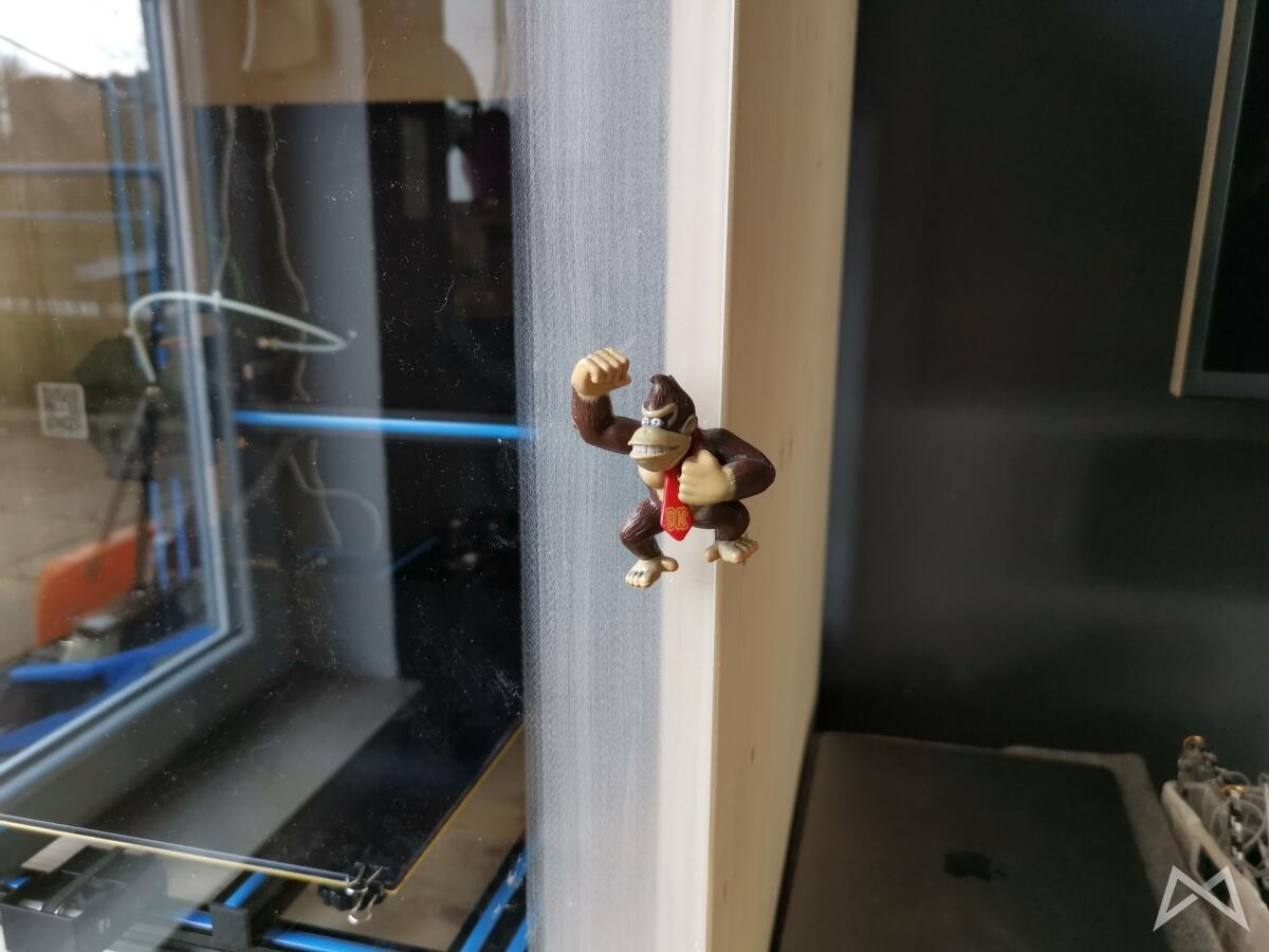 Dann noch zwei Scharniere am Holz und Plexiglas befestigt und die Tür ist schon fast fertig. Fehlt noch eine Lösung, damit die Tür auch geschlossen bleibt. Das geht aber recht einfach. Als Griff diente ein kleiner Donkey Kong, den ich mit einer Schraube ebenfalls im Plexiglas befestigt hatte. Die Rückseite der Schraube hält dann die Tür mit dem Magneten am Gehäuse fest, der am Gegenstück in das Schränkchen geklebt wurde. Fertig. :)