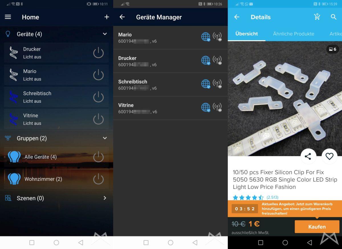 Ebenfalls noch oben im Screenshot seht ihr eine günstige Möglichkeit die LED Stripes ohne irgendwelche Alu-Profile etc. zu befestigen. Der Screenshot ist aus der WISH-App, aber die Teile gibt es natürlich auch bei Amazon und Co. für ein paar Cent mehr.