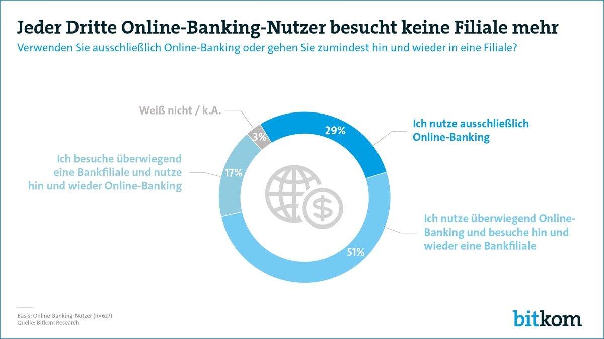 Jeder Zweite (51 Prozent) nutzt Online-Banking überwiegend, geht aber hin und wieder in eine Filiale. Gerade einmal 17 Prozent der Online-Banking-Nutzer sagen, dass sie überwiegend Filialen besuchen und die Online-Funktionen nur ab und an verwenden.