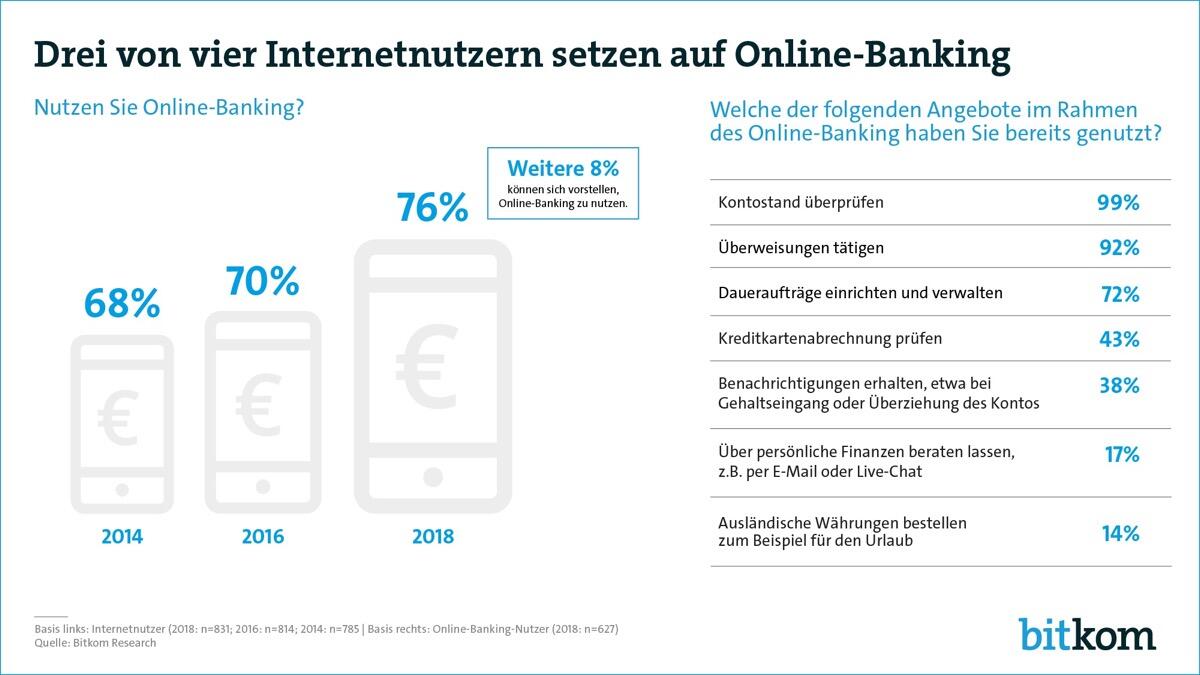 Mehr als drei Viertel (76 Prozent) erledigen ihre Bankgeschäfte inzwischen online. Das ist ein Anstieg gegenüber 2016, als erst 70 Prozent der Internetnutzer auf Online-Banking gesetzt haben.
