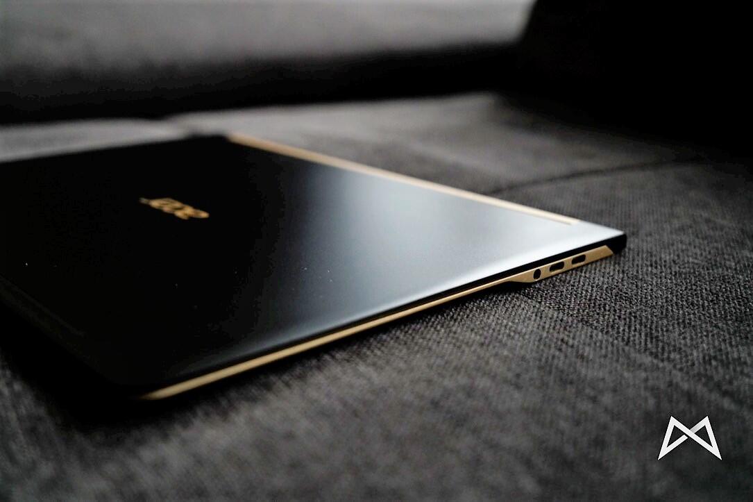 Zu allererst muss ich sagen, dass ich die Farbwahl des Swift 7 sehr gelungen finde. Diese Mischung aus schwarz und gold lässt das Gerät sehr edel wirken. Dazu wurden generell gute Materialien, wie beispielsweise Aluminium verwendet und so ist das Notebook zum einen auch stabil und wirkt nicht so, als ob es durchbrechen würde, wenn man es an einer Seite hält. Trotzdem ist das Acer Swift 7 dabei nur knapp einen Zentimeter dick, leicht und dennoch stabil.