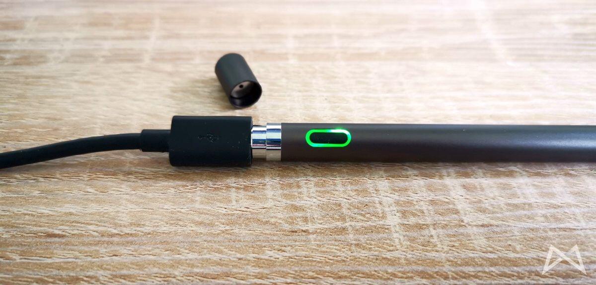 Entweder über den PC, eine Powerbank oder ein (nicht beigelegtes) Netzteil kann der Stylus aufgeladen werden. Der MicroUSB-Anschluss befindet sich auf der Oberseite unter einem magnetischen Deckel. Eine LED um den Powerbutton zeigt den jeweiligen Zustand an.