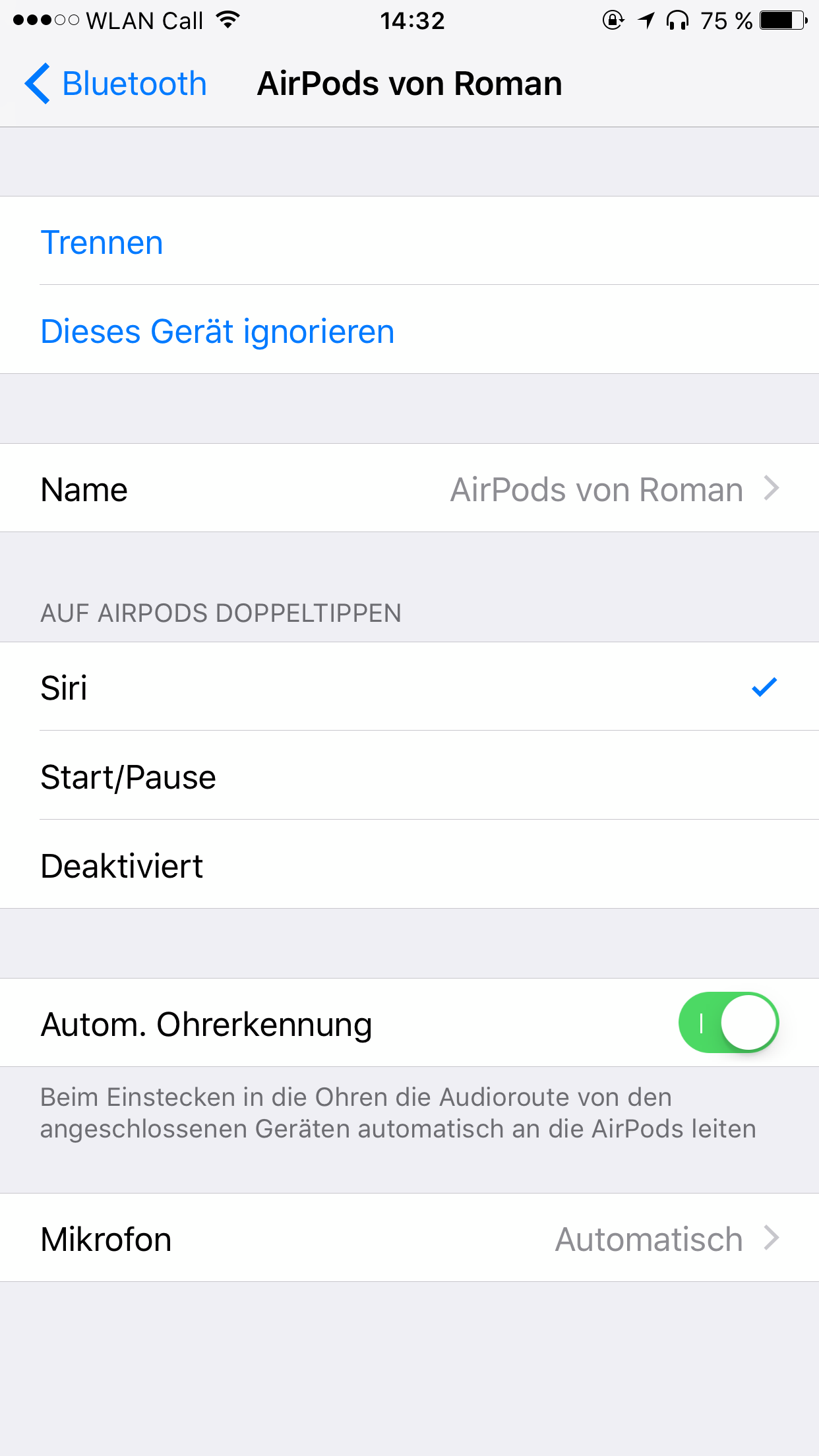 Siri-Modus und Audioroute der AirPods – Screenshot