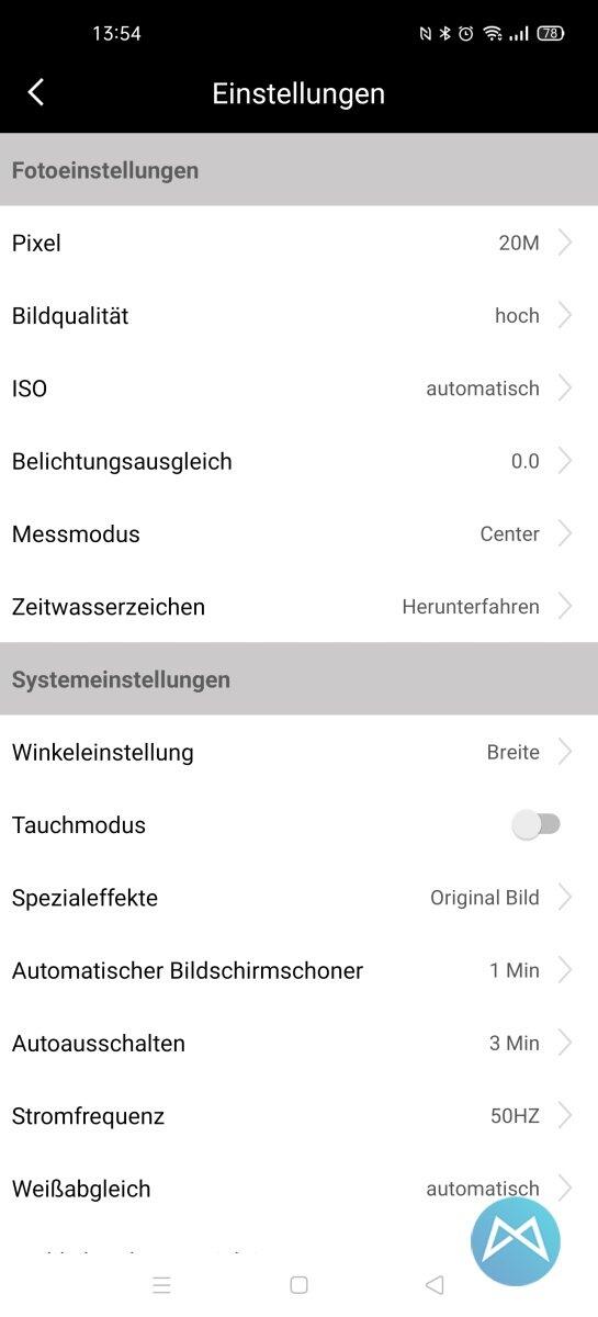 Die Bedienung klappte damit hervorragend. Eine Verbindung via WLAN kam mit nur wenigen Handgriffen zustande, man kann die Einstellungen der Kamera ändern, das Kamerabild live im Handy betrachten, die Galerie auf der Kamera öffnen und im Handy betrachten usw.