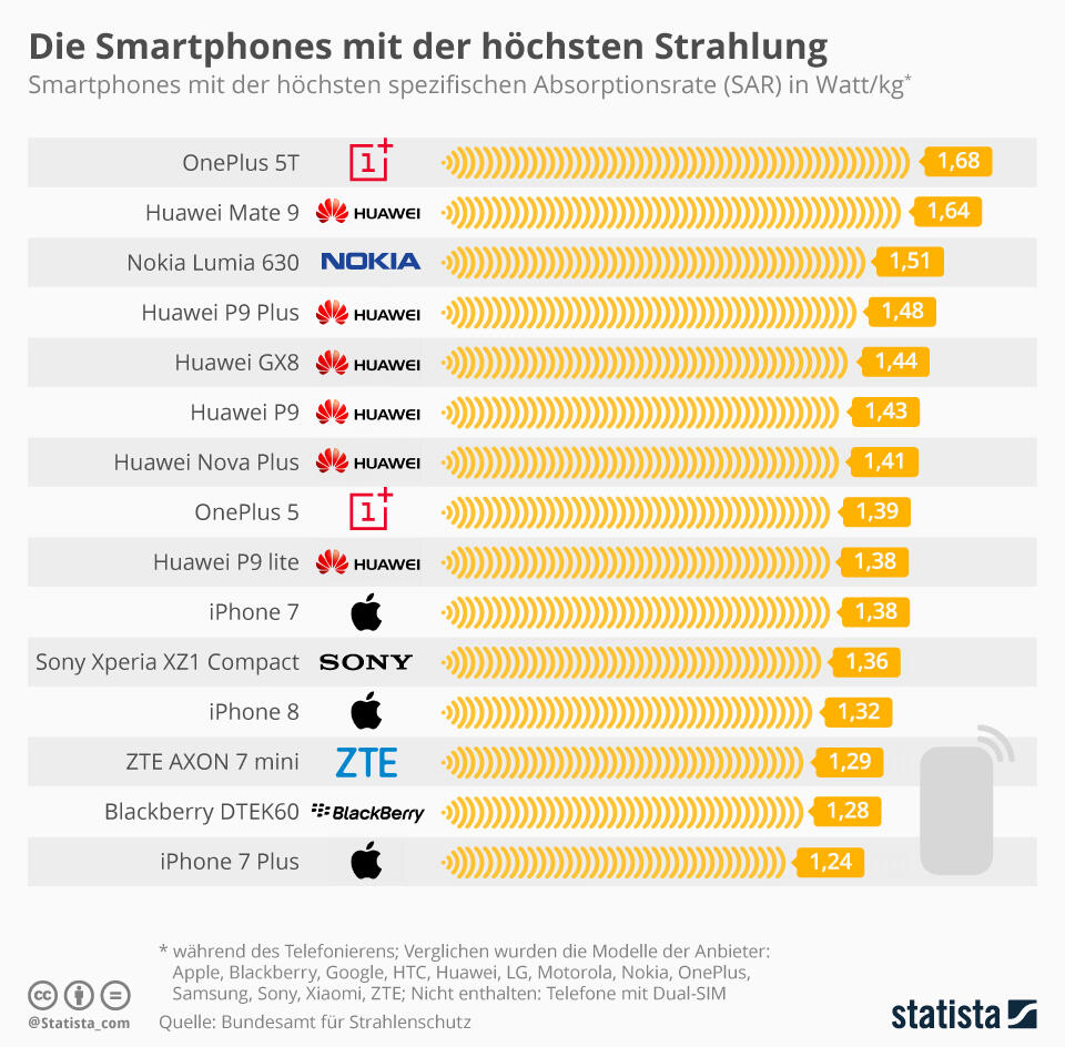Wie die nachfolgende Grafik zeigt, ist von den aktuellen Modellen das OnePlus 5T das Smartphone mit der höchsten Strahlung beim Telefonieren mit dem Gerät am Ohr. Strahlungen mit einer Intensität von 1,68 Watt pro Kilogramm wirken während des Telefonierens auf den menschlichen Körper ein. Insgesamt sind unter den 15 Telefonen mit der höchsten Strahlung neun von chinesischen Herstellern. Aber auch die Smartphones Apple iPhone 7 und 8 liegen in den Top 15.