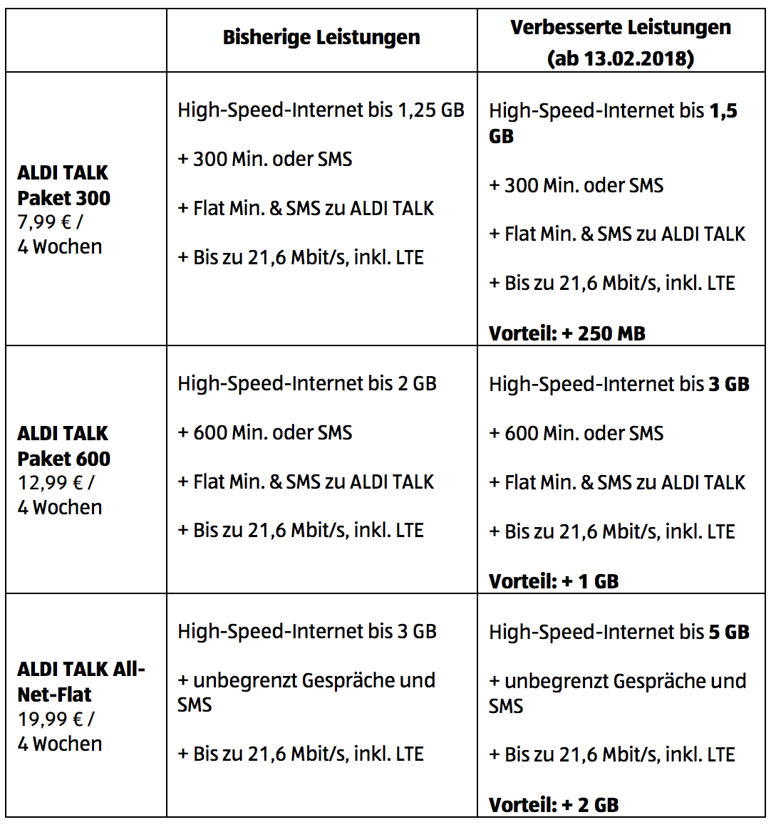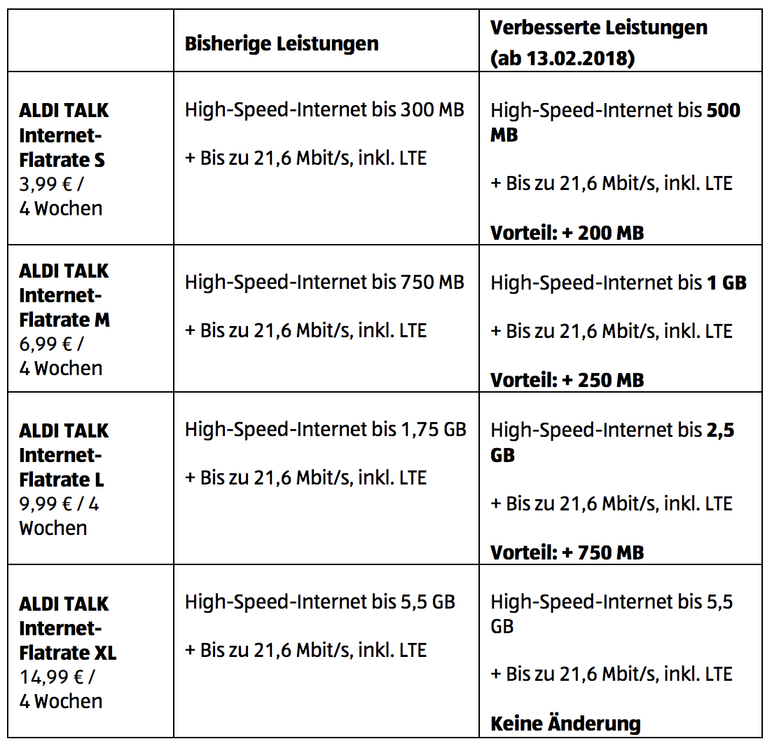 Der Mobilfunkanbieter Aldi Talk erhöht das Datenvolumen. Ab dem heutigen 13. Februar 2018 erhalten alle Bestands- und Neukunden bei Neubuchung oder Paketverlängerung dauerhaft mehr Datenvolumen für acht Tarifoptionen.