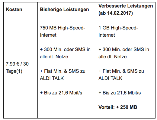 Für 7,99 Euro pro 30 Tage ist im ALDI TALK Paket 300 künftig ein „High-Speed Datenvolumen“ von 1 GB statt zuvor 750 MB enthalten. Wie zuvor surfen Kunden mit bis zu 21,6 MBit/s. An den weiteren Inklusiveinheiten ändert sich nichts, hier gibt es weiterhin 300 Einheiten für Gespräche oder SMS in alle deutschen Netze. Gespräche und SMS zu ALDI TALK sind zudem wie bisher kostenlos. Kunden, die das High-Speed-Datenvolumen des ALDI TALK Paket 300 vor dem Ende der Optionslaufzeit verbraucht haben, können dies für 5 Euro wieder auf null setzen.
