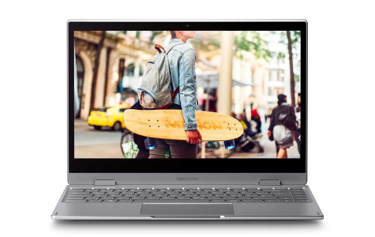 Das Medion Akoya E4272 ist mit einem 14 Zoll großen FullHD-Touch-Display ausgestattet, welches um 360 Grad rotiert werden kann. Dadurch kann das Notebook in vier verschiedenen Positionen (Tablet-, Stand-, Notebook- und Zelt-Modus) verwendet werden.
