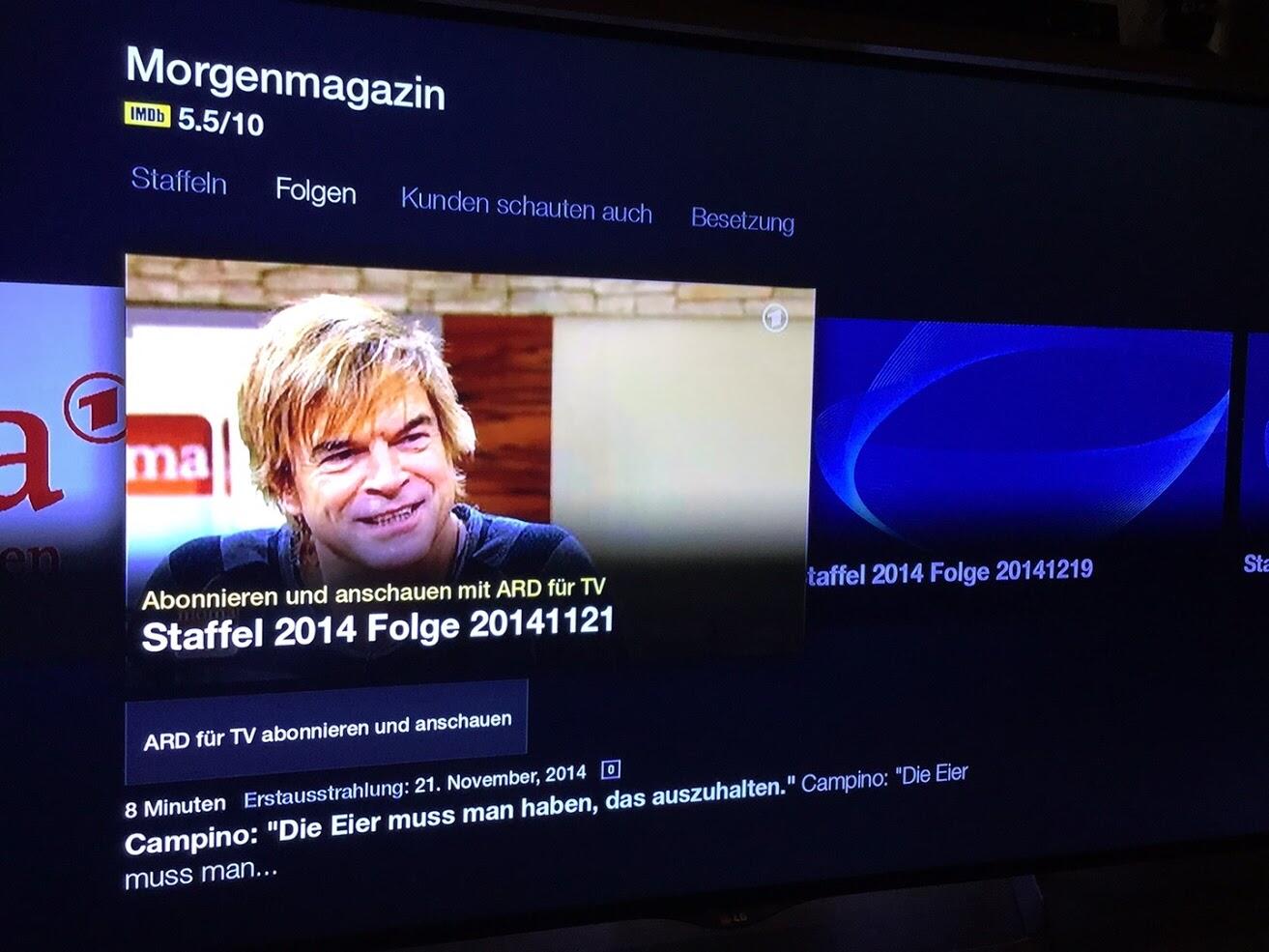 Bislang scheint das neue Feature exklusiv für die ARD-App ausgerollt, bis auch andere Apps eingebunden werden, dürfte es noch etwas dauern. Beim Tatortreiniger beispielsweise werden die ARD-eigenen Inhalte direkt neben den Instant-Video-Folgen gelistet, dort erscheint dann ein kleiner Verweis auf die ARD-Anwendung.