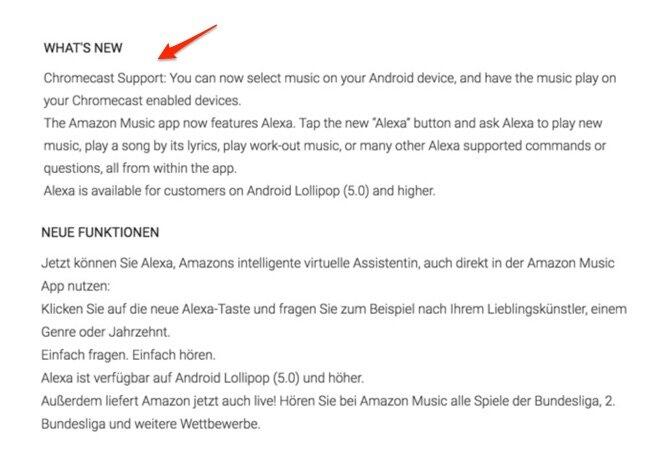 Daher kommt der heutige Schritt ein bisschen überraschend: Die App für Amazon Music unterstützt nun Chromecast. Zumindest in den USA, dort findet man den Hinweis auch im Changelog der Android-App. In Deutschland gibt es keinen Hinweis auf Chromecast-Support, der restliche Changelog wurde übersetzt.