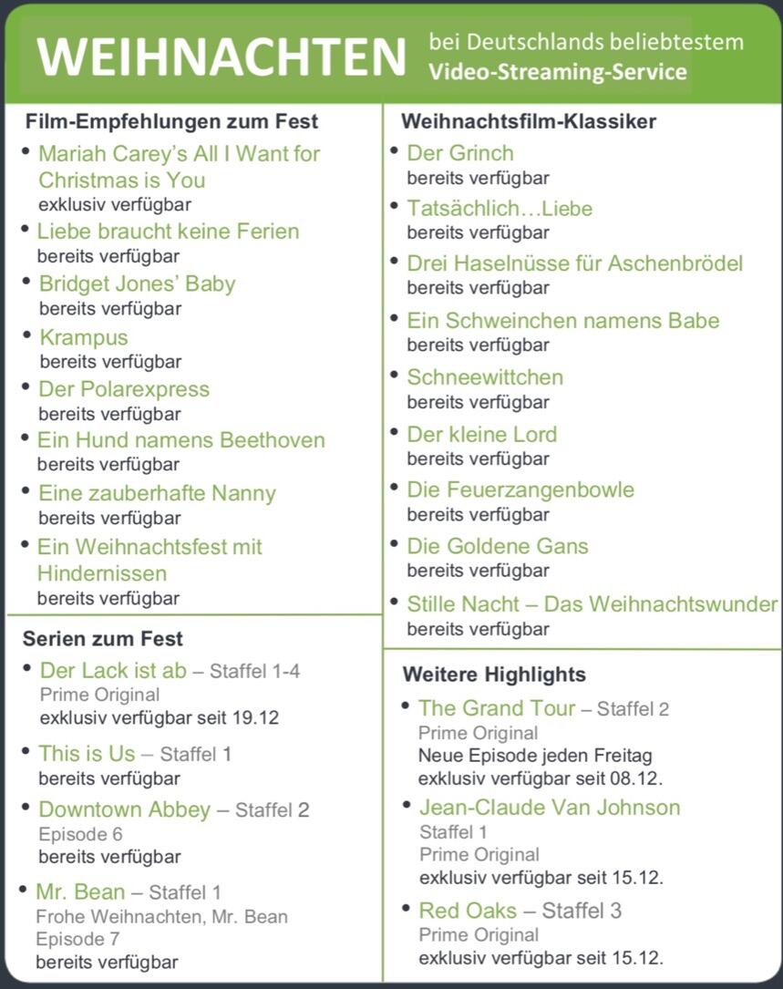 Mit dabei sind unter anderem Der Grinch, This Is Us, Mariah Carey’s All I Want for Christmas is You, die Komödie Bridget Jones’ Baby sowie die Klassiker Drei Haselnüsse für Aschenbrödel und Der kleine Lord.