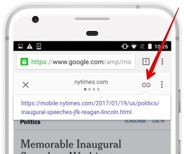 In der Webversion der AMP-Sites gibt es nun ein kleines Links-Icon, über das man die Original-URL eines Beitrags teilen kann. Weiterhin werden zukünftig auch in Google Apps die AMP-URLs beim Teilen automatisch zu den original URLs der Website gewandelt.