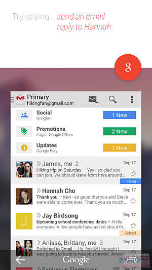 Zum Homescreen soll man dann wohl über die Multitasking-Ansicht kommen, indem man dort von links nach rechts wischt. Hat man die Sprachsuche geöffnet, soll der Sprachassistent dann offenbar auch verschiedene Aktionen vorschlagen, die möglich sind – beispielsweise das Beantworten oder Weiterleiten von E-Mails aus Gmail heraus.